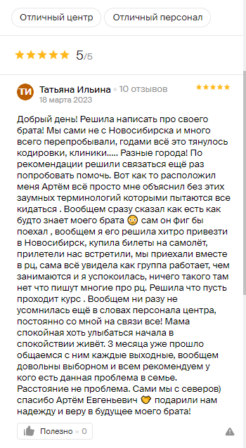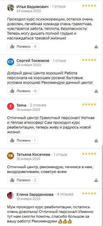 Всё это в совокупности даёт потрясающий результат и стабильную ремиссию. Практически никто из выпускников, прошедших полный курс лечения, не возвратились к употреблению наркотиков.
